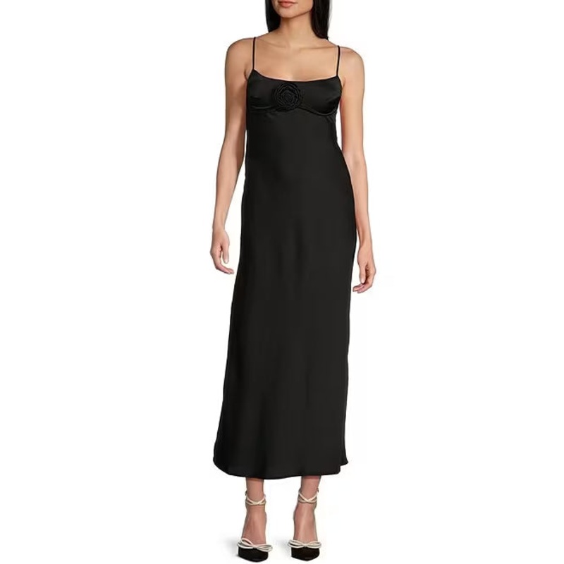 Satin low neck thin shoulder strap with rose back hollowed out suspender prom dress