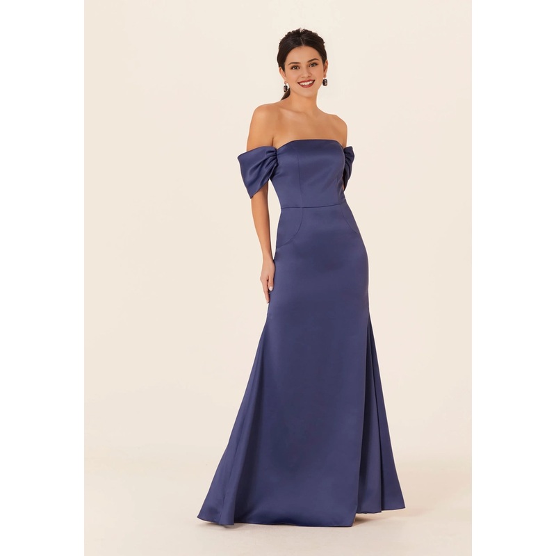 Satin straight neckline off shoulder sleeves trumpet shaped bridesmaid dress