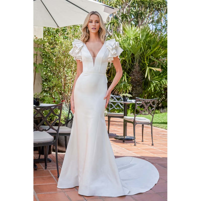 Satin V-neck ruffled sleeves backless and floor length wedding dress