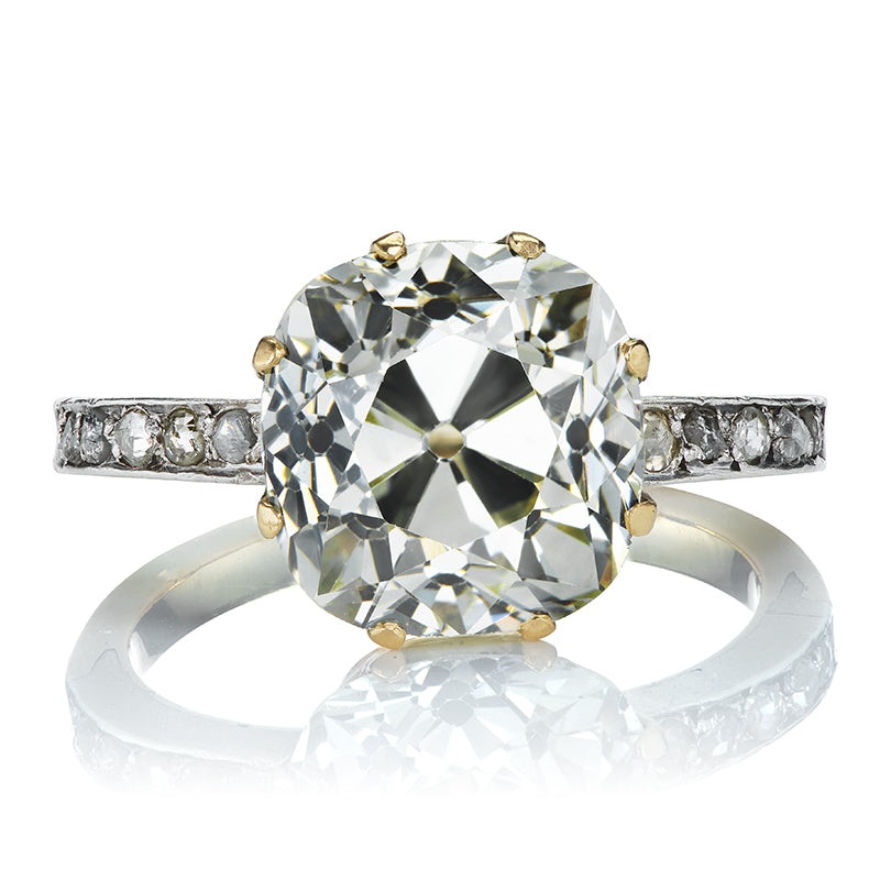The Saverine ring is an authentic vintage diamond ring from the Edwardian Era circa 1900. The ring centers a GIA-certified 5.02-carat Old Mine Cut diamond of Q-R color, SI1 clarity. On each shoulder are five Old Cut diamonds.The stones are set in an 18kt yellow gold and platinum setting. The ring is currently size 5.75 and can be resized!