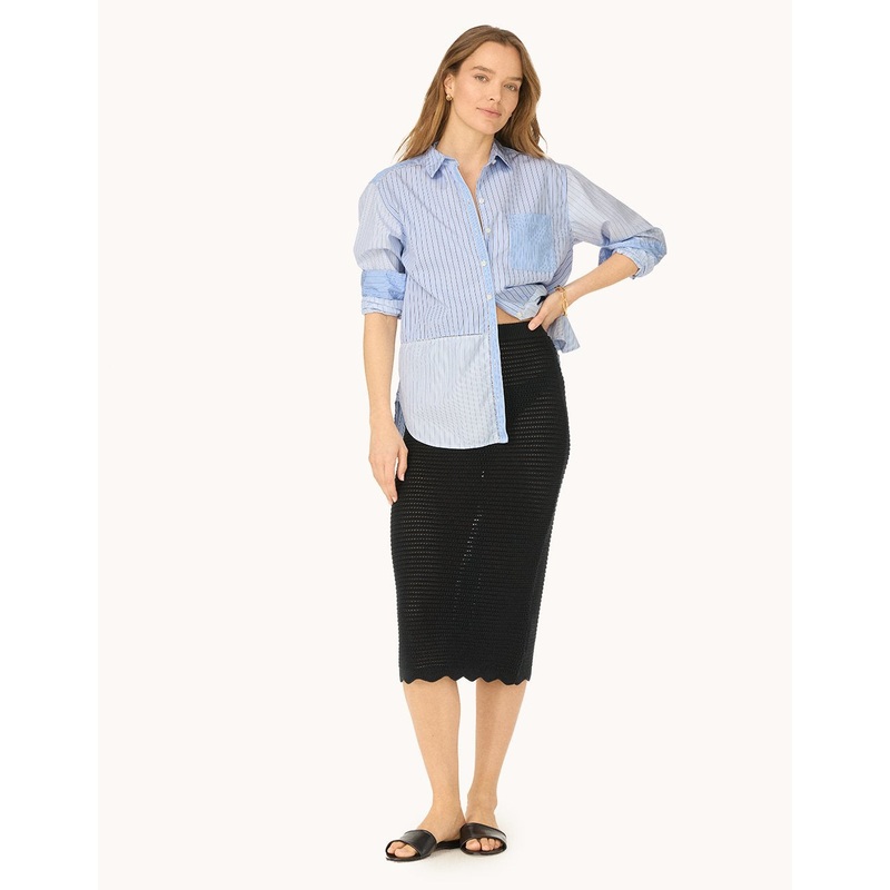 a beachside classic, this sweater skirt is crafted from cotton with crochet-inspired stitching for a textured finish. the scalloped hem lends a vintage touch.