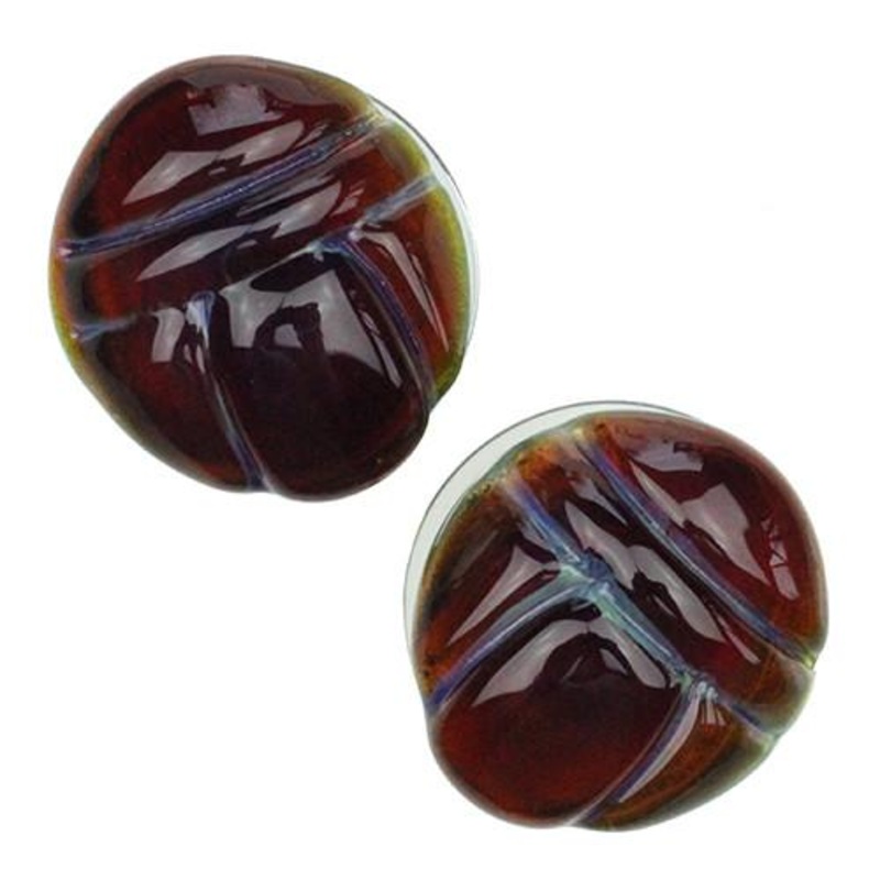 These double flare scarab plugs are made from hand blown borosilicate glass by Glasswear Studios. They have a wearable area of approximately 3/8" between flares. Choose your size and color below.