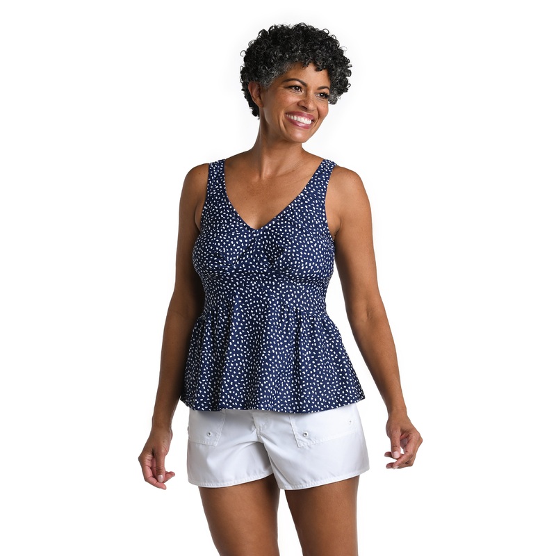 Embrace a timeless retro vibe with this top adorned in an indigo and white polka dot print, channeling a playful and classic aesthetic. It has a flattering empire cut that cinches above your natural waist, instantly slimming the tummy with a flowy fit. Removable cups with underwires and thick fixed straps offer comfortable support. Top sold separately.