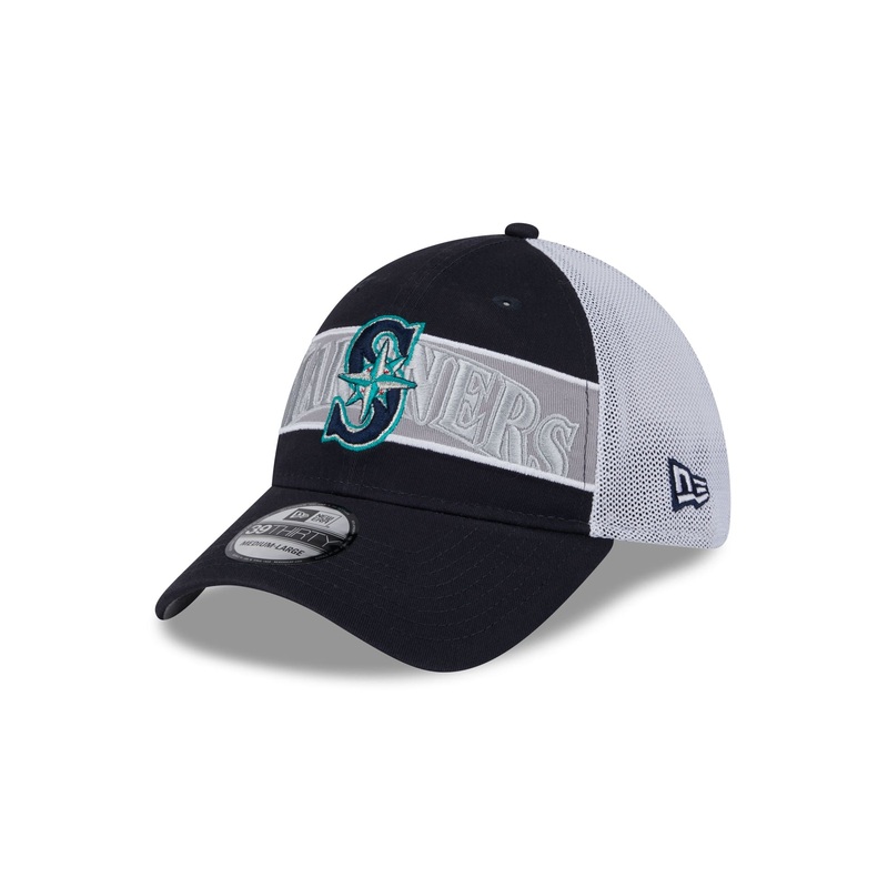 The Seattle Mariners Banded 39THIRTY Stretch Fit Cap features an embroidered Mariners logo at the front panels with a team wordmark at the rear. Additional details include a mesh stretch fit and a gray undervisor.