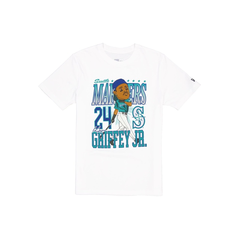 The Seattle Mariners Ken Griffey Jr. Caricature T-Shirt features the player’s name and number with the Mariners logo and wordmark screen-printed at the front.