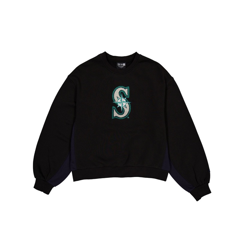 The Seattle Mariners Sport Night Women’s Crewneck features a chenille applique Mariners logo at the front with team color stripes at the balloon sleeves.