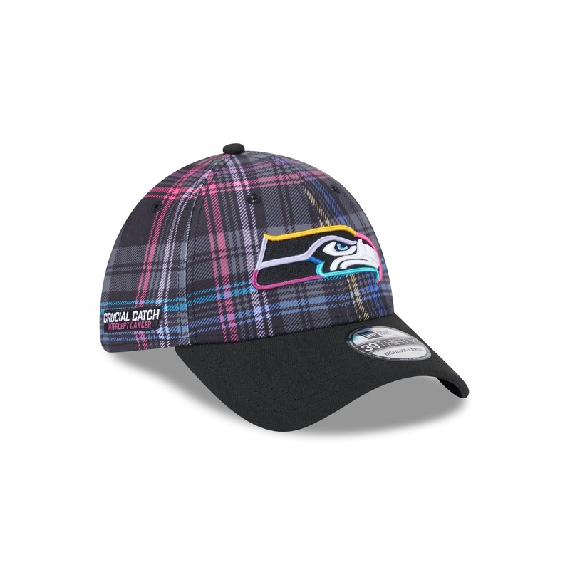 The Seattle Seahawks 2024 Crucial Catch 39THIRTY Stretch Fit Hat features an embroidered Seahawks logo at the front panels with a matching NFL Shield at the rear. Additional details include a Crucial Catch Intercept Cancer patch at the right-wear side and a black undervisor.