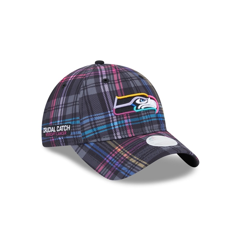 The Seattle Seahawks 2024 Crucial Catch Women's 9TWENTY Adjustable Hat features an embroidered Seahawks logo a the front panels with a matching Crucial Catch Intercept Cancer patch at the right-wear side. Additional details include an NFL Shield above an a