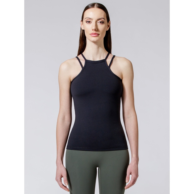 Made with NIETEL+ Engineered by AUMNIE+ High performance stretch fabric+ Elastaneblend for soft luxe comfortDESCRIPTIONTrendy halter style full length tank with double straps for street to studioFull coverage bra great for low to medium impact activitiesBu