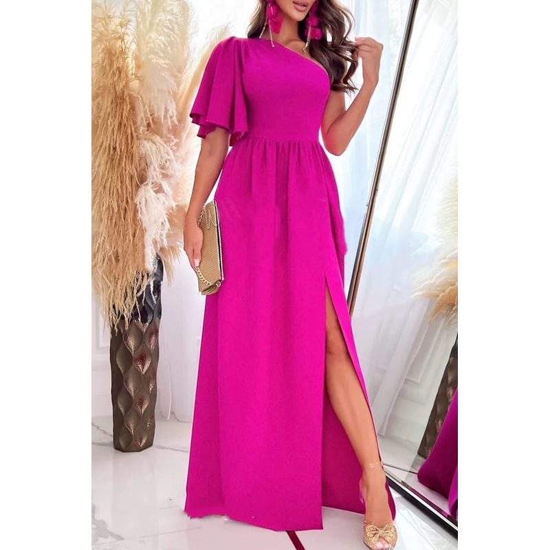 Sexy and elegant solid color patchwork slit with diagonal collar and straight leg evening dress
