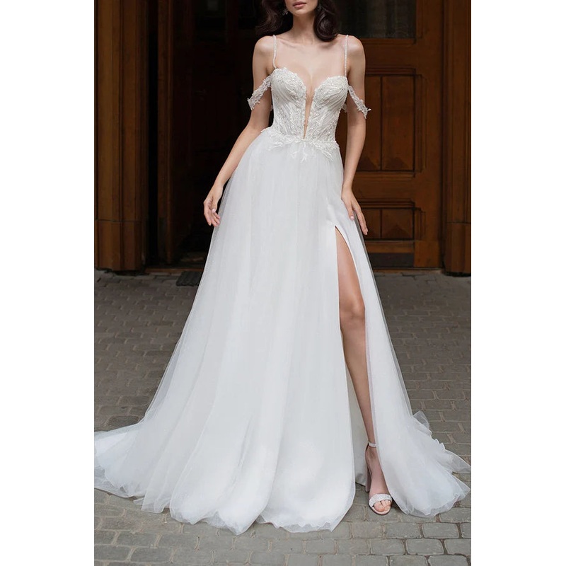 Sexy deep V-neck beaded side slit A-line pastoral wedding dress