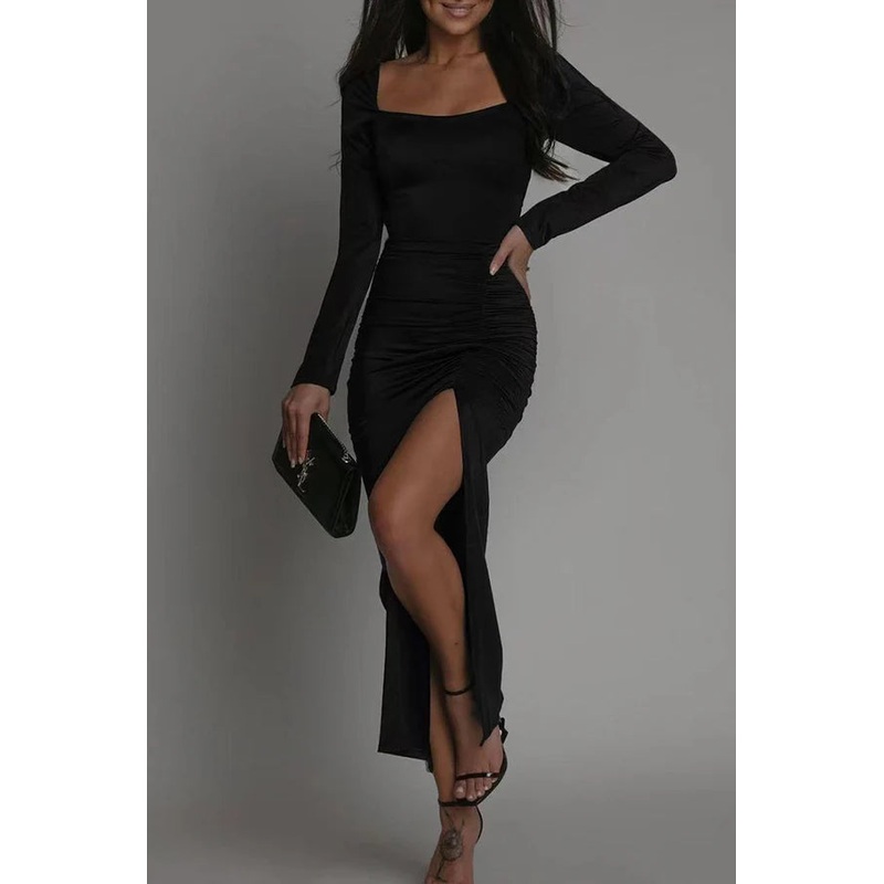 Sexy solid color backless slit square collar wrap around skirt for evening dress