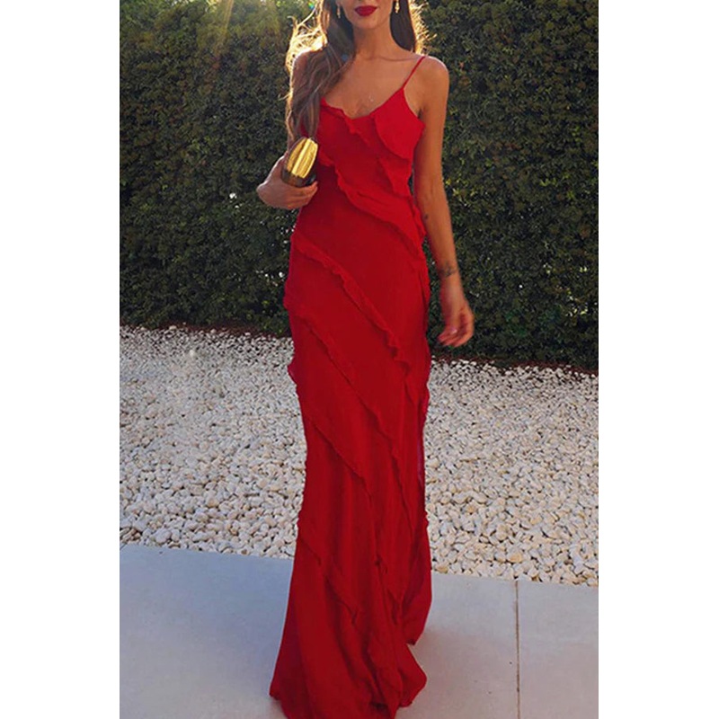Sexy solid color ruffled edge slit V-neck strap for evening dressing