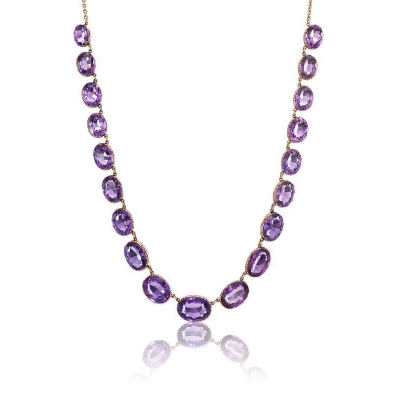 The Seymour necklace is an authentic Antique AmethystRivire from theVictorian era.Nineteenamethysts are collet-set along a 10kt yellow gold chain with an additional amethyst on the clasp. The inner circumference of the necklace is 19 inches.