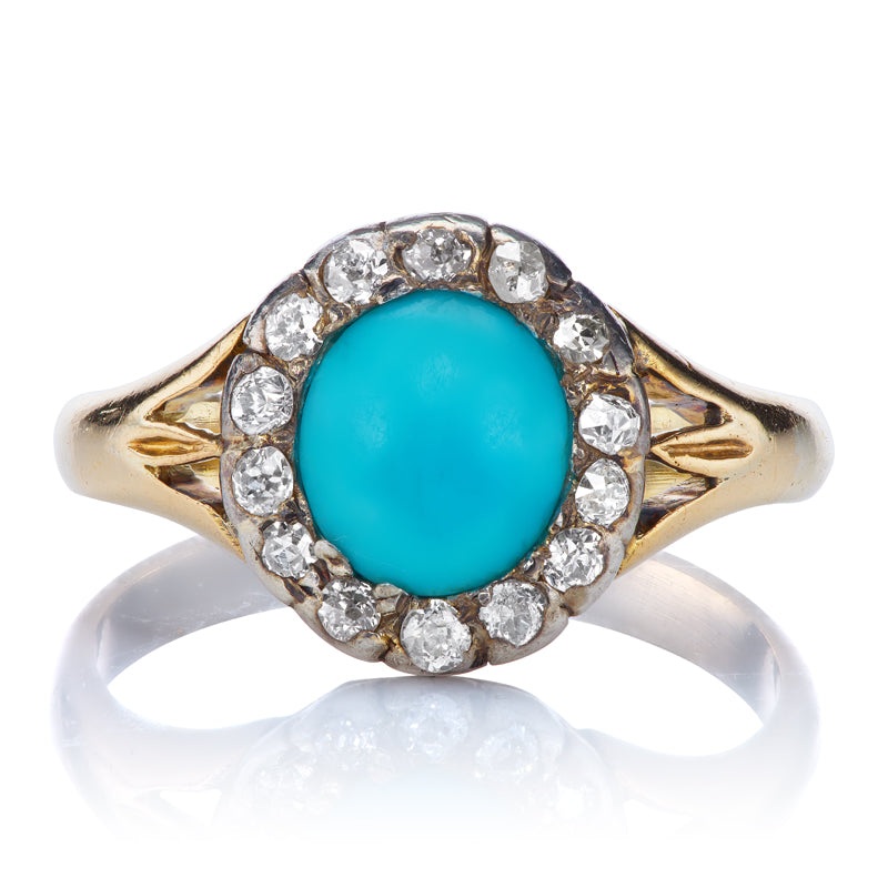 A stunning pop of color for your collection. The turquoise has a dreamy Tiffany Blue hue, beautifully complemented by a bright halo of old-cut stones that add the perfect shimmer to this low-profile piece.