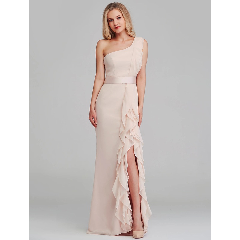 Sheath / Column Bridesmaid Dress One Shoulder Sleeveless Elegant Long Length Chiffon with Cascading Ruffles
