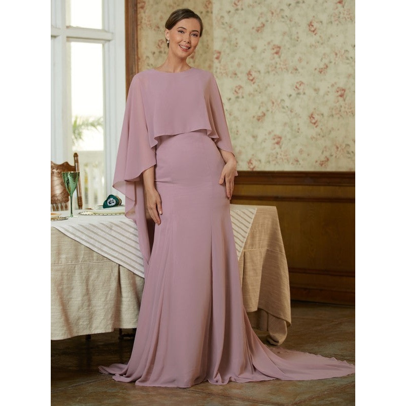Sheath/Column Chiffon Ruffles Scoop Long Sleeves Sweep/Brush Train Mother of the Bride Dresses