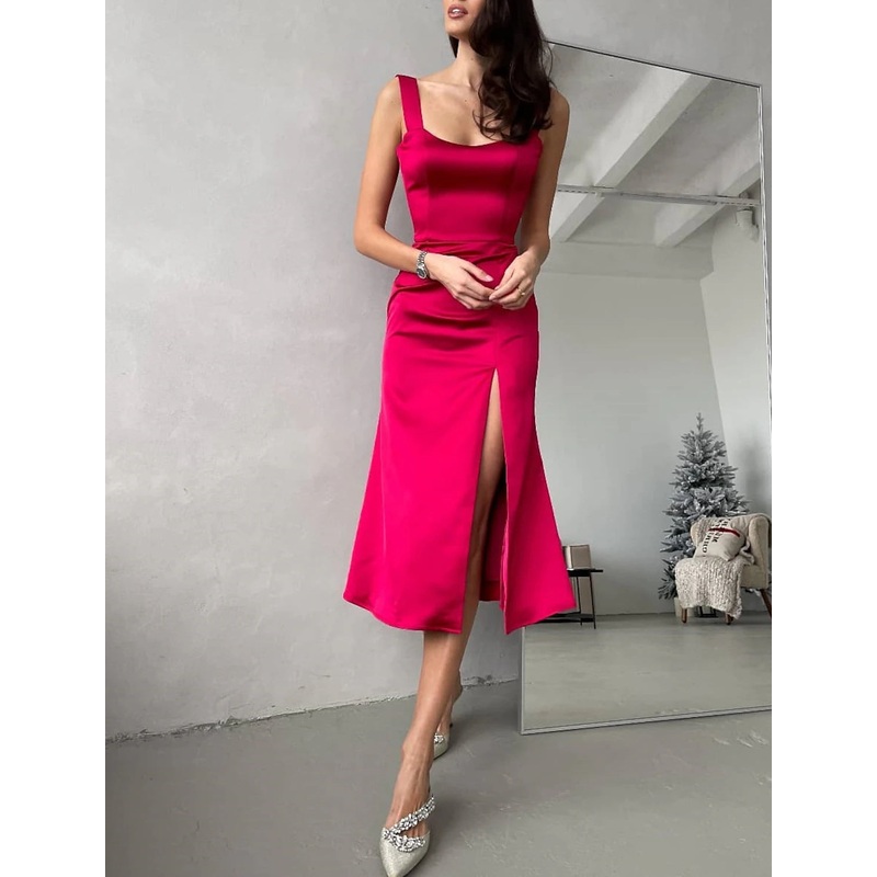 Sheath / Column Cocktail Dresses Elegant Dress Wedding Guest Cocktail Party Tea Length Short Sleeve Scoop Neck Satin with Draping Slit