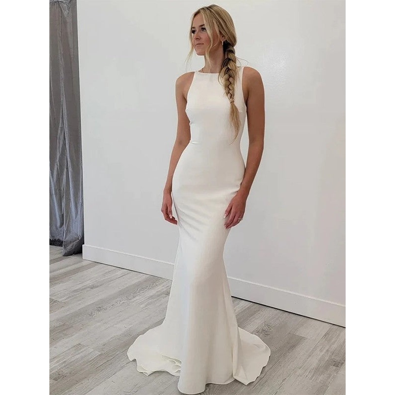 Sheath/Column Crepe Bateau Sleeveless Sweep/Brush Train Wedding Dresses