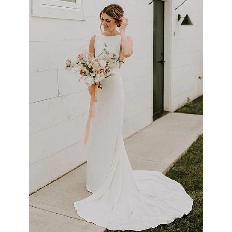Sheath/Column Crepe Ruched Jewel Sleeveless Sweep/Brush Train Wedding Dresses