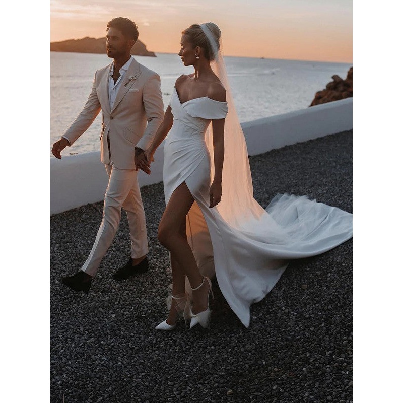 Sheath/Column Crepe Ruched Off-the-Shoulder Sleeveless Chapel Train Wedding Dresses