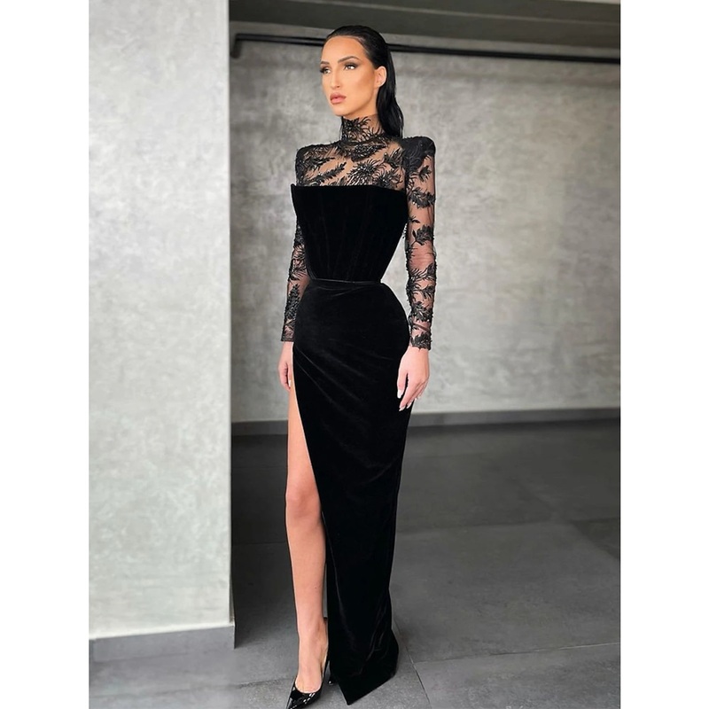 Sheath / Column Evening Gown Elegant Dress Formal Black Dress Plus Size Floor Length Long Sleeve High Neck Lace with Slit