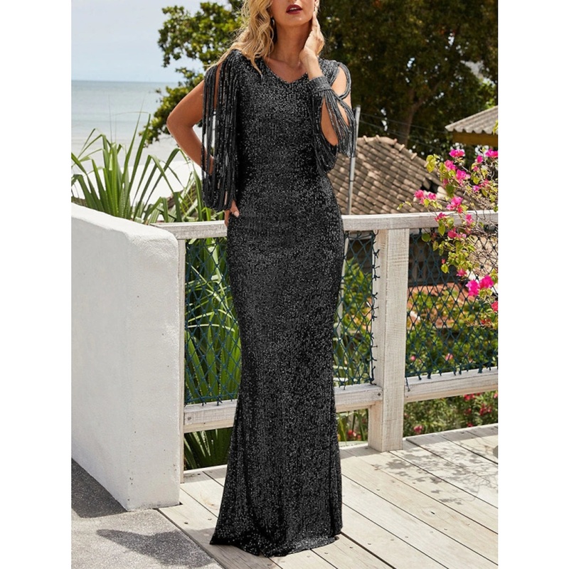 Sheath / Column Evening Gown Sparkle & Shine Dress Wedding Guest Party Wear Sweep / Brush Train Long Sleeve V Neck Sequined with Glitter Pleats