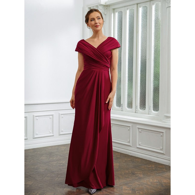 Sheath/Column Jersey Ruched V-neck Short Sleeves Floor-Length Mother of the Bride Dresses