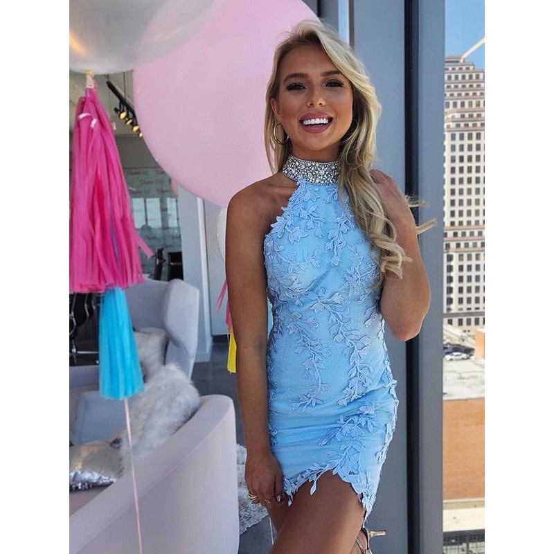 Sheath/Column Lace Beading Halter Sleeveless Short/Mini Homecoming Dresses