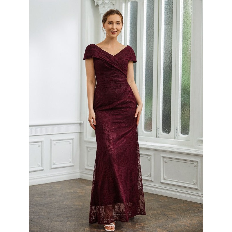 Sheath/Column Lace Ruched V-neck Short Sleeves Floor-Length Mother of the Bride Dresses