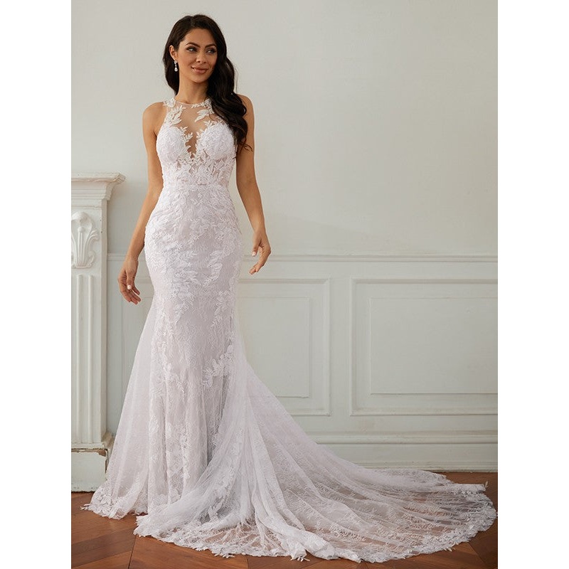 Sheath/Column Lace Scoop Sleeveless Court Train Wedding Dresses