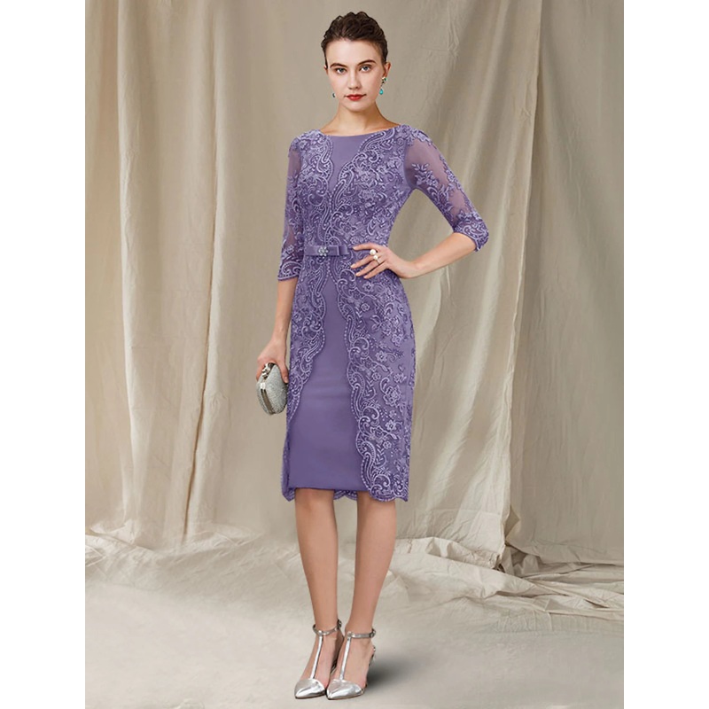 Sheath / Column Mother of the Bride Dress Elegant Bateau Neck Knee Length Chiffon Lace 3/4 Length Sleeve with Bow(s) Appliques