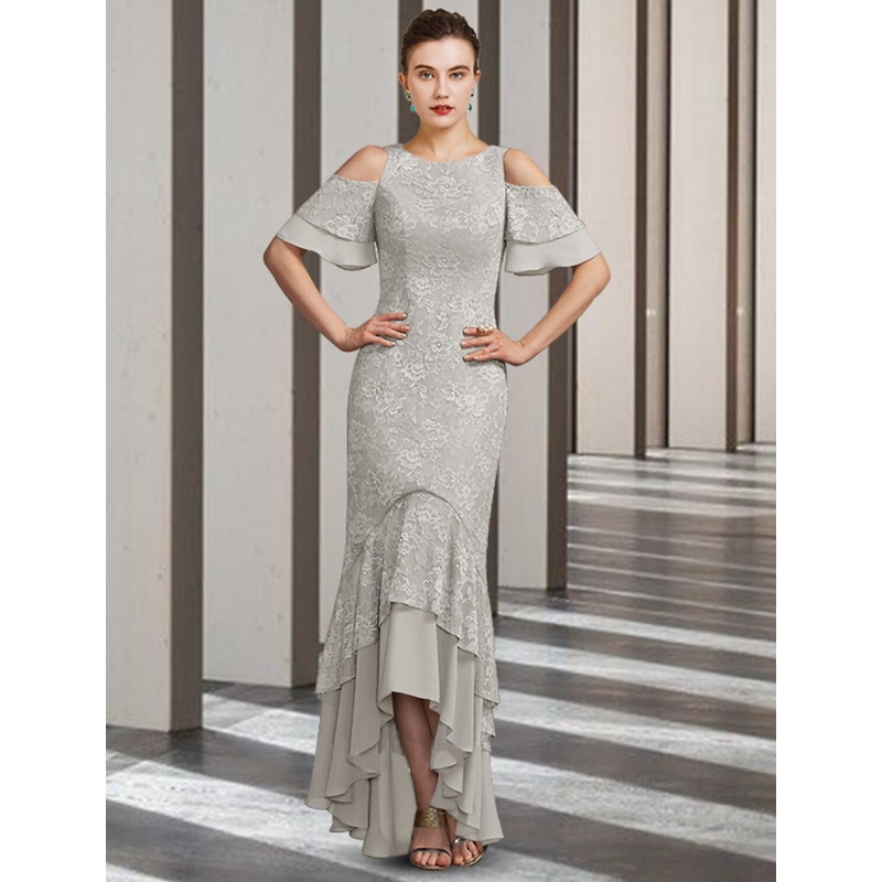 Be the first to review “Sheath / Column Mother of the Bride Dress Elegant High Low Jewel Neck Floor Length Chiffon Lace Short Sleeve with Ruffles” Cancel reply