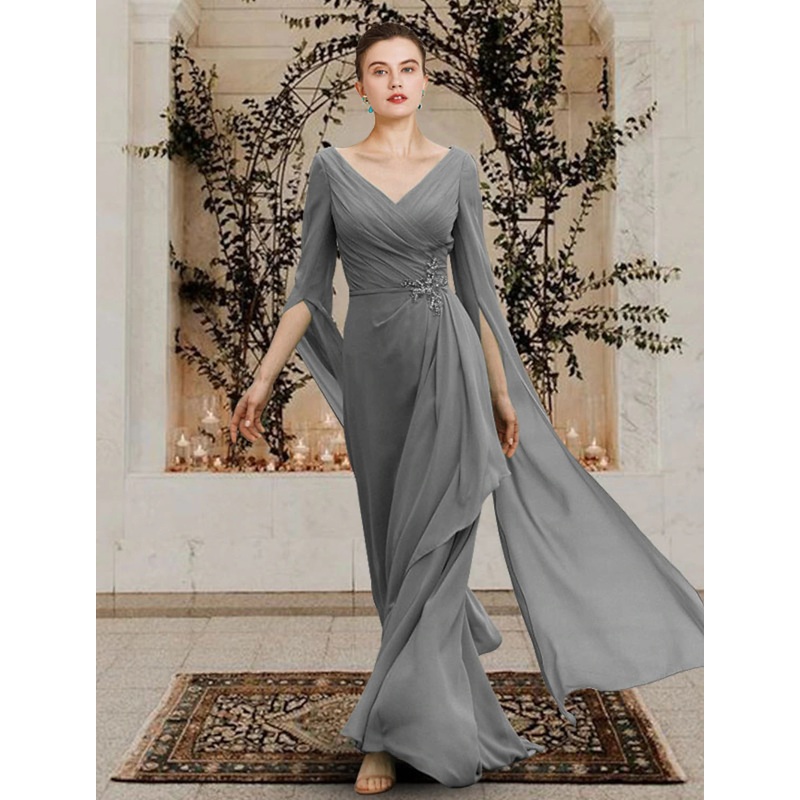 Sheath / Column Mother of the Bride Dress Elegant V Neck Floor Length Chiffon Half Sleeve with Beading Side-Draped
