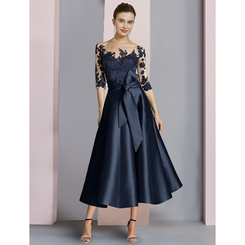 Sheath / Column Mother of the Bride Dress Fall Wedding Guest Party Elegant Scoop Neck Ankle Length Satin Lace Half Sleeve with Bow(s) Pleats