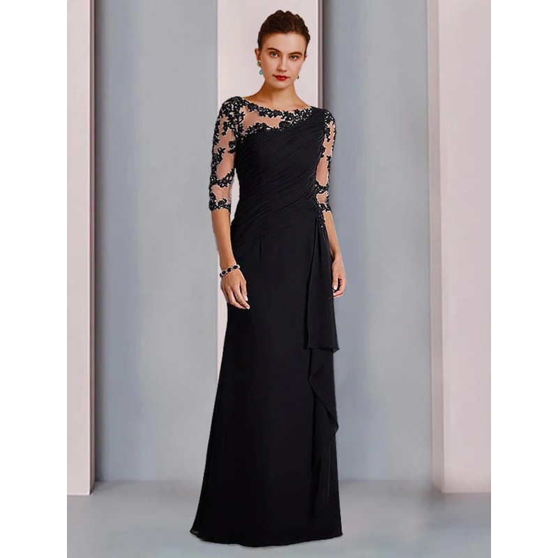 Sheath / Column Mother of the Bride Dress Formal Fall Wedding Guest Dresses Elegant Jewel Neck Floor Length Chiffon Lace 3/4 Length Sleeve with Beading Appliques