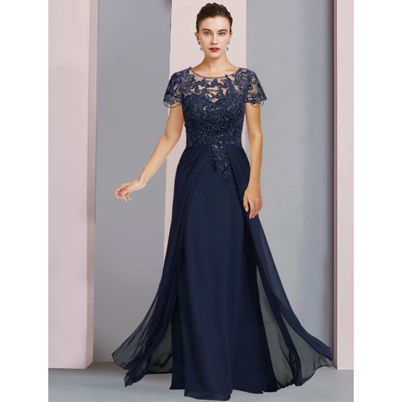 Sheath / Column Mother of the Bride Dress Formal Luxurious Elegant Scoop Neck Floor Length Chiffon Lace Short Sleeve with Sequin Appliques