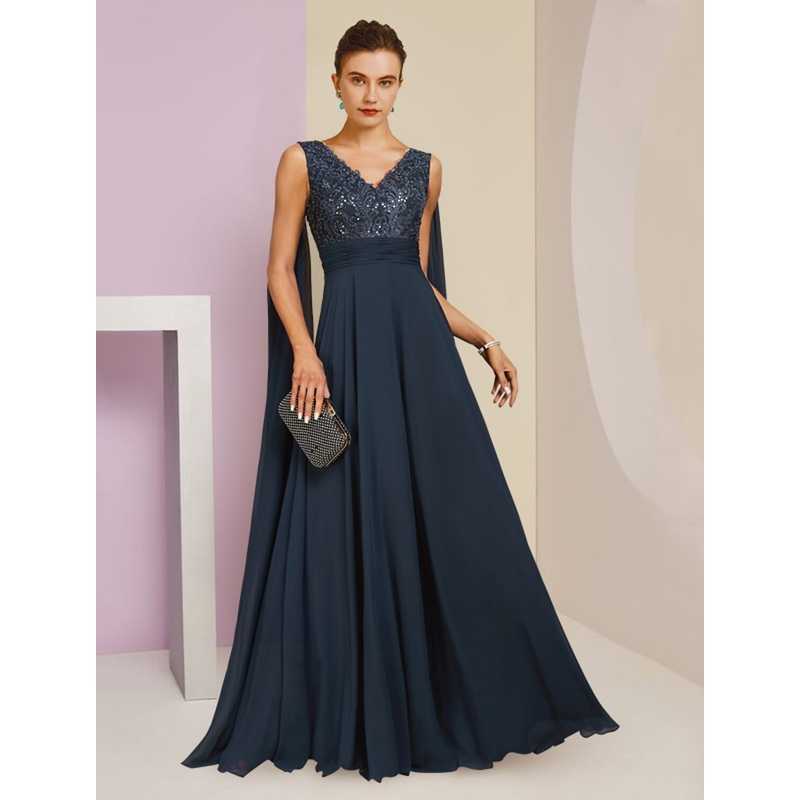 Sheath / Column Mother of the Bride Dress Formal Party Elegant V Neck Floor Length Chiffon Lace Sleeveless with Pleats Sequin