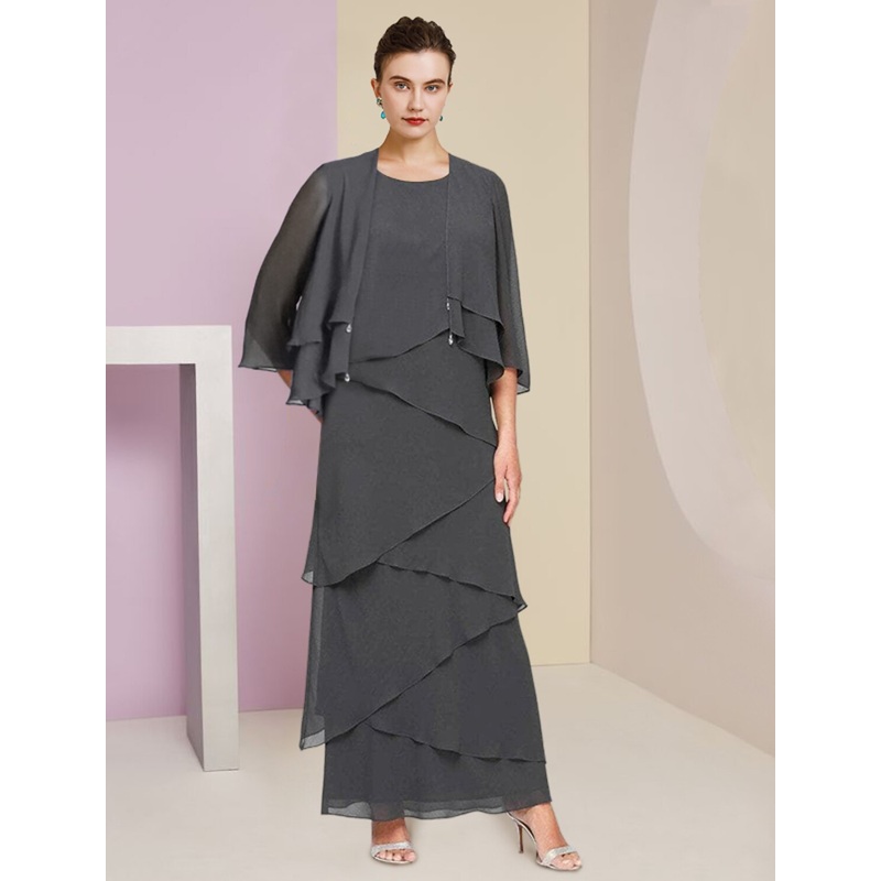 Sheath / Column Mother of the Bride Dress Formal Wedding Guest Elegant Scoop Neck Ankle Length Chiffon Sleeveless Wrap Included with Cascading Ruffles