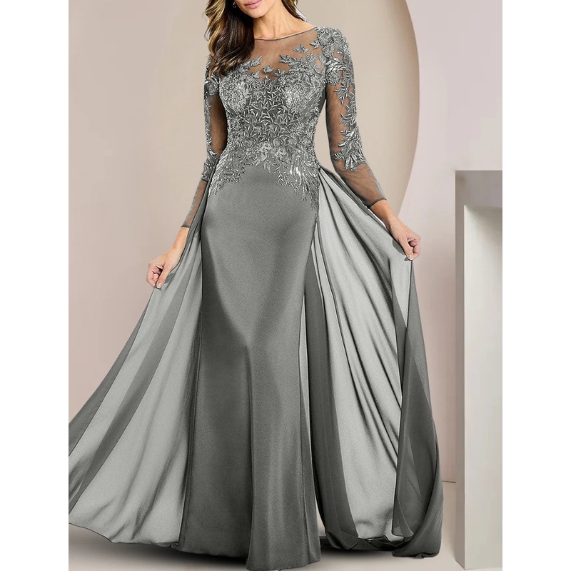Sheath / Column Mother of the Bride Dress Formal Wedding Guest Elegant Scoop Neck Floor Length Chiffon Lace Long Sleeve with Beading Appliques