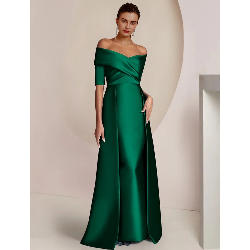 Be the first to review “Sheath / Column Mother of the Bride Dress Formal Wedding Guest Party Elegant Off Shoulder Floor Length Satin Half Sleeve with Ruching” Cancel reply