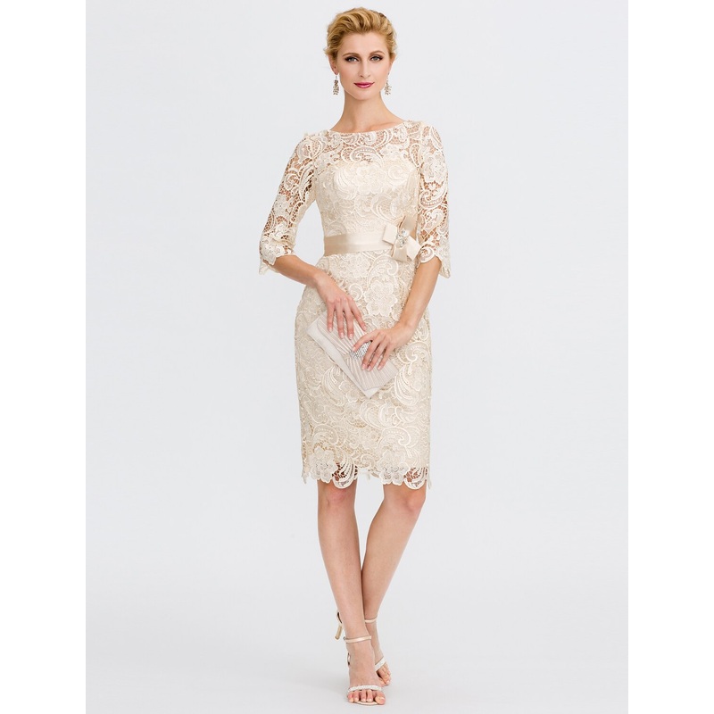 Sheath / Column Mother of the Bride Dress Formal Wedding Guest Plus Size Elegant Illusion Neck Knee Length All Over Lace 3/4 Length Sleeve with Bow(s)