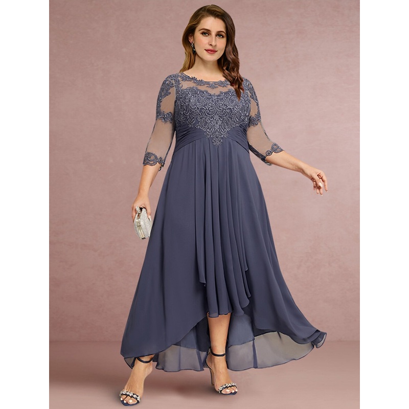 Sheath / Column Mother of the Bride Dress Wedding Guest Elegant Jewel Neck Asymmetrical Chiffon Lace 3/4 Length Sleeve with Pleats Solid Color