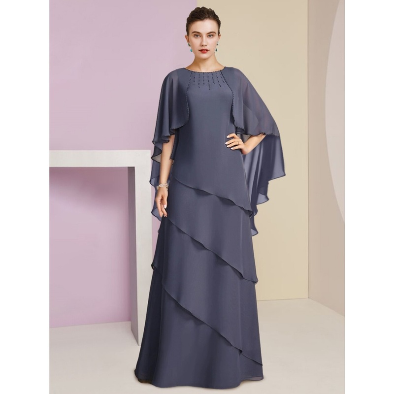 Sheath / Column Mother of the Bride Dress Wedding Guest Elegant Jewel Neck Floor Length Chiffon Half Sleeve with Sequin Tier Solid Color