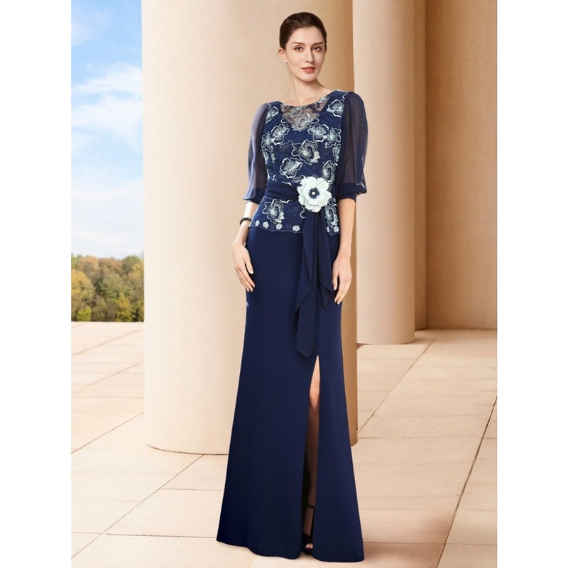 Sheath / Column Mother of the Bride Dress Wedding Guest Elegant Jewel Neck Floor Length Chiffon Half Sleeve with Split Front Ruching Flower