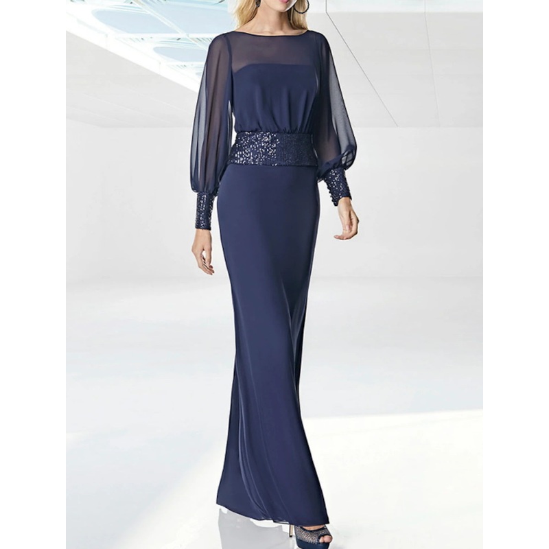 Sheath / Column Mother of the Bride Dress Wedding Guest Elegant Jewel Neck Floor Length Chiffon Sequined Long Sleeve with Sash / Ribbon