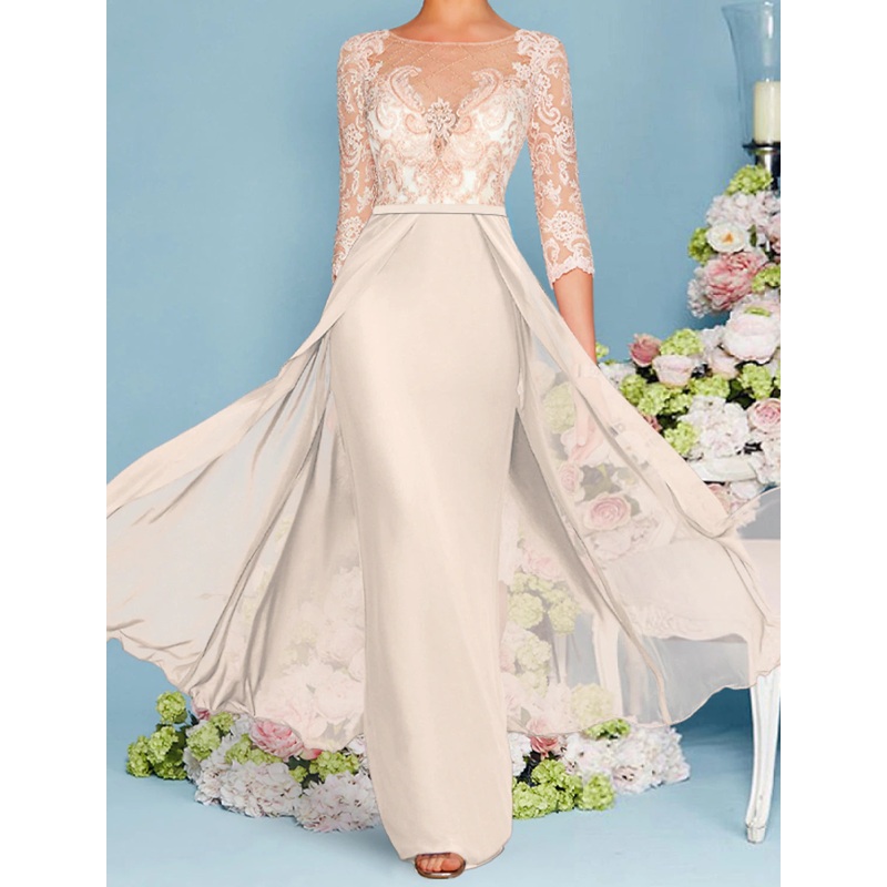 Sheath / Column Mother of the Bride Dress Wedding Guest Elegant Luxurious Scoop Neck Floor Length Chiffon Lace 3/4 Length Sleeve with Beading Appliques