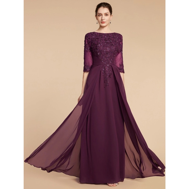 Be the first to review “Sheath / Column Mother of the Bride Dress Wedding Guest Elegant Scoop Neck Floor Length Chiffon Lace Half Sleeve with Pleats Sequin” Cancel reply
