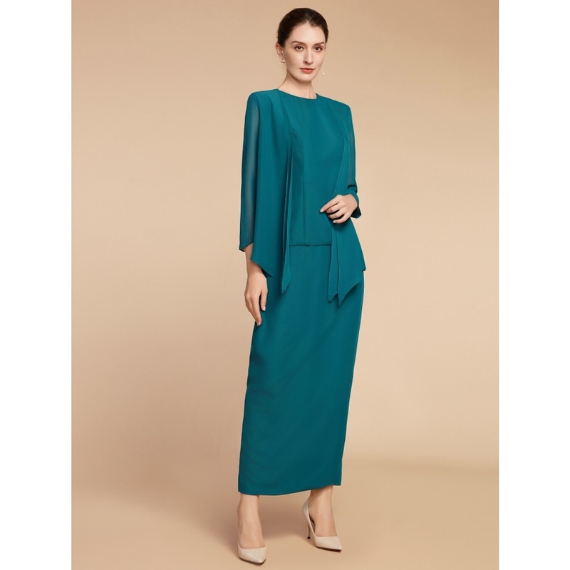 Sheath / Column Mother of the Bride Dress Wedding Guest Elegant Simple Jewel Neck Ankle Length Chiffon Long Sleeve with Split Front Ruching Solid Color