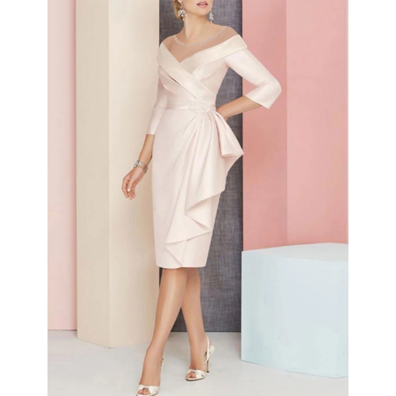 Sheath / Column Mother of the Bride Dress Wedding Guest Elegant Vintage Plus Size V Neck Knee Length Satin 3/4 Length Sleeve with Sash / Ribbon Ruching